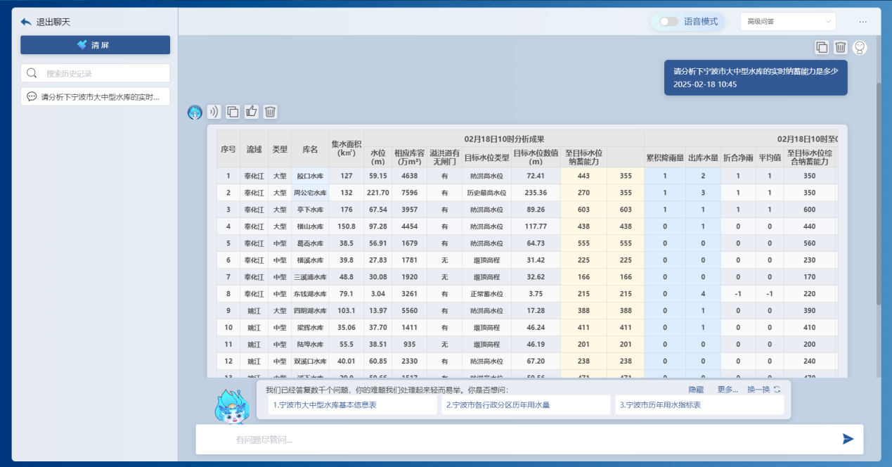 基于前端感知的降雨、水位、流量、工程運行等實時信息,借助DeepSeek大模型和“甬水院智算”算法庫,能夠?qū)崟r對流域防汛形勢進行快速分析,包括降雨形勢、水情預(yù)警、預(yù)泄分析、水庫納蓄分析等,可以按照規(guī)定的表單形式一鍵輸出成果,為防汛防洪工作提供兼具前瞻性、科學(xué)性、精準(zhǔn)性、安全性的決策支撐。相關(guān)學(xué)術(shù)成果曾以《基于大模型的水利防汛智能問答關(guān)鍵技術(shù)研究與應(yīng)用探索》為題于去年8月的第七屆城市水安全與水管理學(xué)術(shù)交流會作專題匯報。