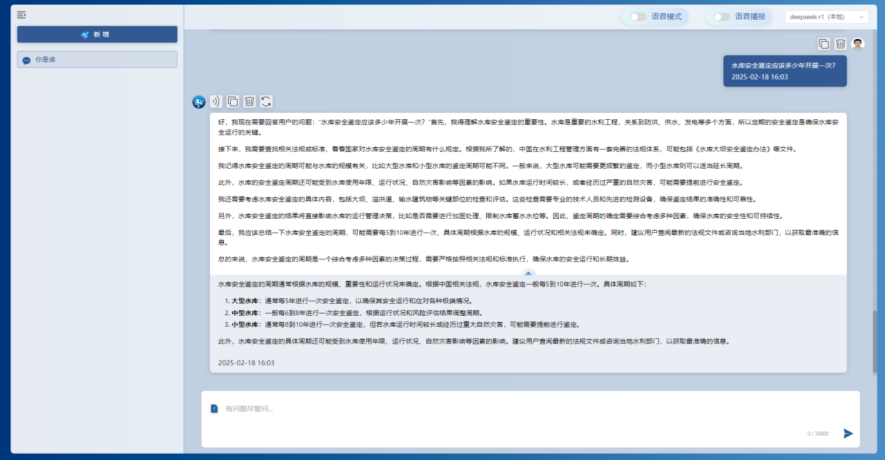 基于本地部署的DeepSeek-r1模型和私域知識庫,通過該工具能夠?qū)崿F(xiàn)對水利行業(yè)的水旱災(zāi)害防御、水資源管理、水工程管理、水生態(tài)保護等各領(lǐng)域知識的高效檢索問答,節(jié)省大量查閱資料的時間,提高工作效率。
