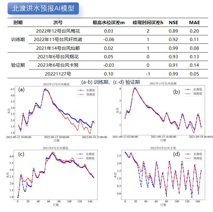 利用成熟水利專業(yè)模型模擬計算不同降雨潮位邊界條件下的洪水過程數(shù)據(jù),再基于DeepSeek對海量洪水模擬數(shù)據(jù)成果進行模型訓(xùn)練和蒸餾。目前我院已對北渡、鎮(zhèn)海等重要流域控制站點進行了AI洪水預(yù)報模型訓(xùn)練和精度驗證,結(jié)果表明AI洪水預(yù)報的準(zhǔn)確性不輸傳統(tǒng)水利專業(yè)模型。