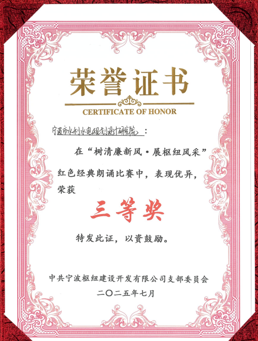 為慶祝中國共產黨成立104周年,2025年7月1日,寧波樞紐建設開發(fā)有限公司隆重舉行了“紅動樞紐·同心共建”迎“七一”主題黨建活動。作為寧波樞紐片區(qū)重要參建單位和黨建聯(lián)盟成員,我院黨總支書記、副院長王洪霞帶隊參與了本次活動,并且,我院兩位青年職工攜選送作品在“樹清廉新風·展樞紐風采”樞紐片區(qū)紅色經(jīng)典朗誦比賽中榮獲三等獎。