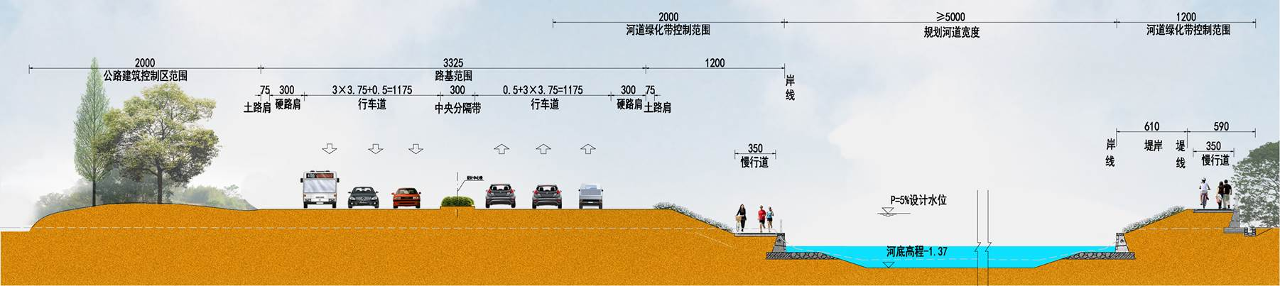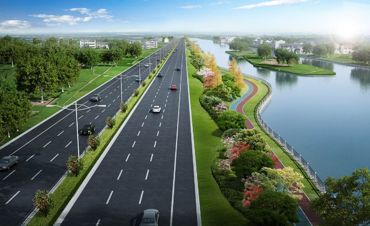 工程位于海曙區(qū)西側(cè),南起鄞江,北至姚江,為實現(xiàn)對海曙西側(cè)山區(qū)洪水的攔截,共整治河道長24km,建設閘站40座,閘門總凈寬554m,泵站22m3/s,改建新建橋梁42座。其中有3.5km與G228國道并線,為協(xié)調(diào)國道與河道之間用地布局,通過優(yōu)化河道斷面型式和堤線線位,實現(xiàn)了對土地的集約利用,打造一條海曙西部交通和河道的靚麗風景線。