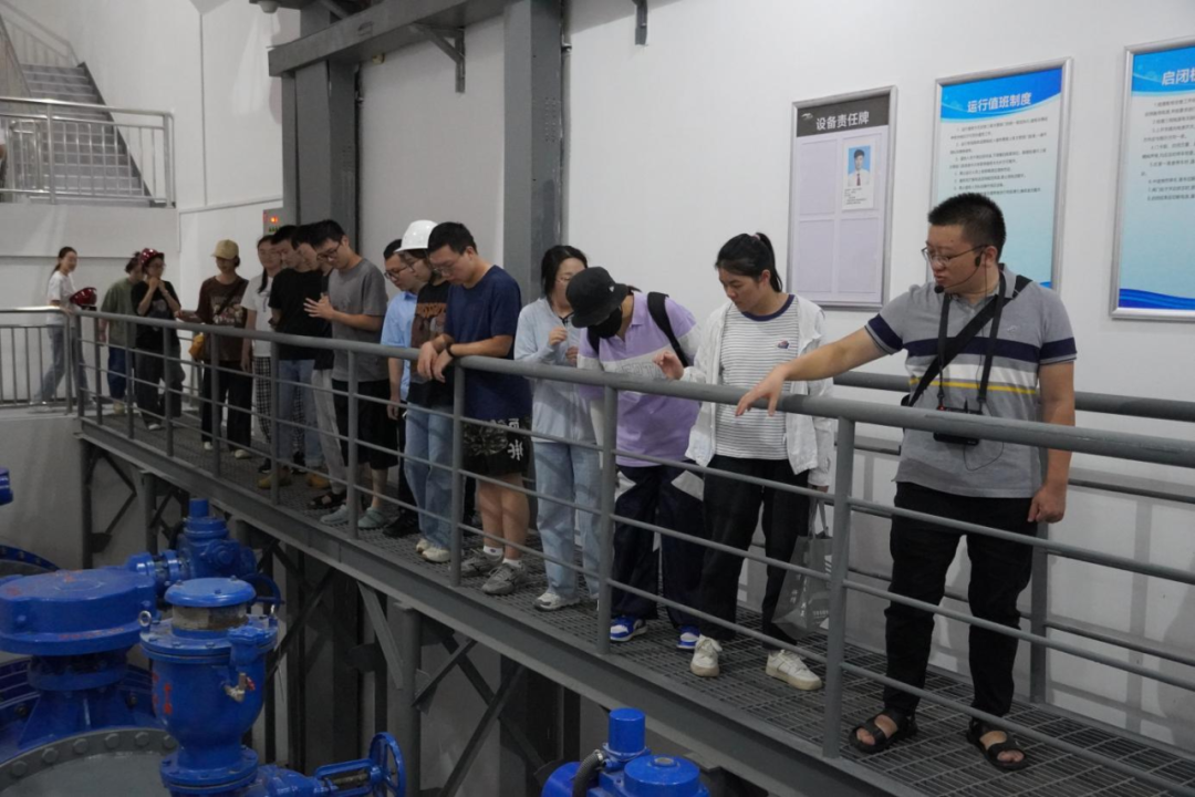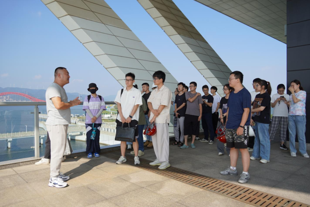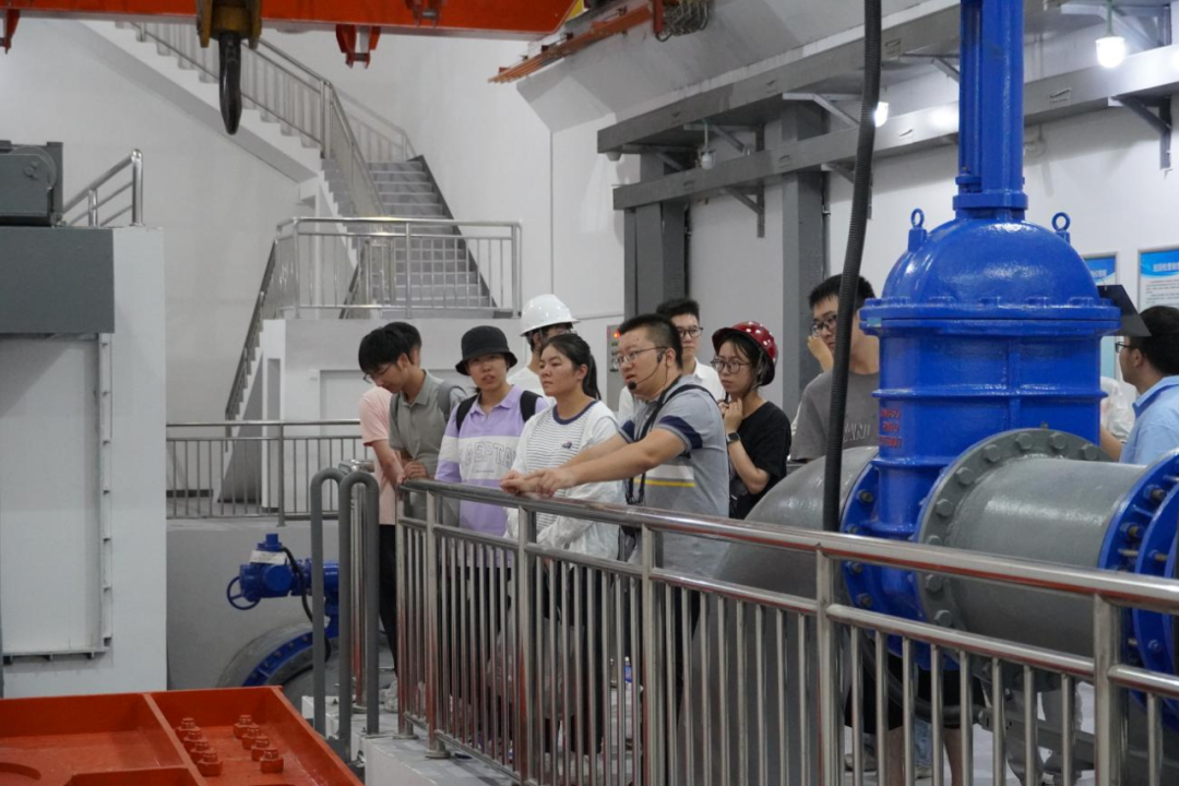 最后,研學(xué)隊(duì)伍來到北堤樞紐參觀。該工程榮獲中國建筑行業(yè)工程質(zhì)量的最高榮譽(yù)獎(jiǎng)——2020-2021年度第一批中國建設(shè)工程魯班獎(jiǎng)。胡經(jīng)理帶領(lǐng)研學(xué)隊(duì)伍依次進(jìn)入啟閉機(jī)房、觀景臺(tái)、控制室等處,現(xiàn)場講解工程設(shè)計(jì)思路、建造工藝和管理要點(diǎn)。